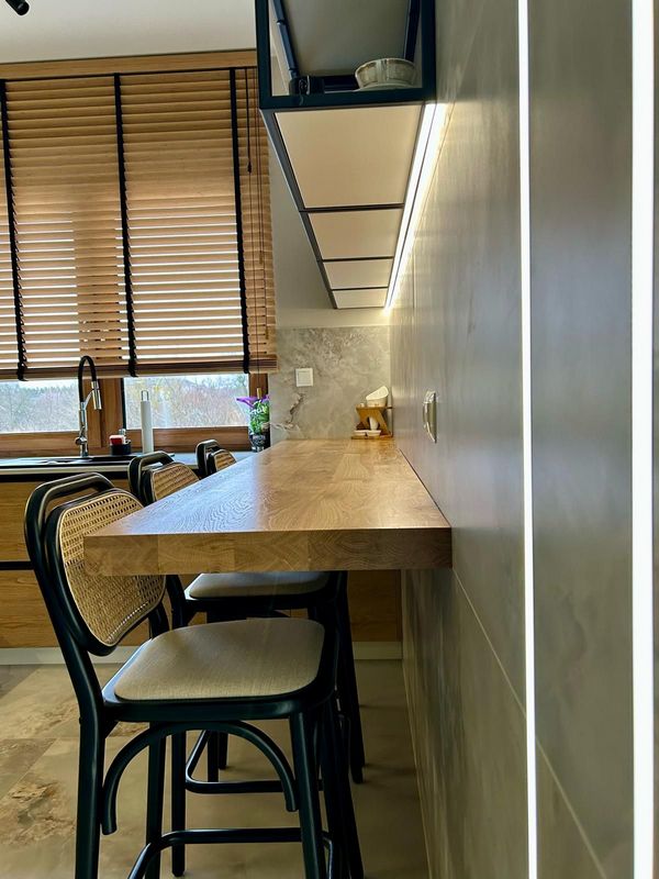 Kuchnia na wymiar od MAXdesign to nie tylko piękno, ale również innowacyjne rozwiązania, które czynią codzienne czynności prostszymi i przyjemniejszymi. Wbudowane oświetlenie LED tworzy ciepłą atmosferę i zwiększa komfort pracy, a także podkreśla elegancki charakter forniru i połysk czarnych powierzchni. Praktyczne rozwiązania, takie jak systemy cichego domykania, wewnętrzne organizery czy wysuwane półki, pozwalają na utrzymanie porządku i ergonomii. Każdy element został starannie przemyślany, aby użytkownik mógł cieszyć się harmonią i funkcjonalnością na co dzień.